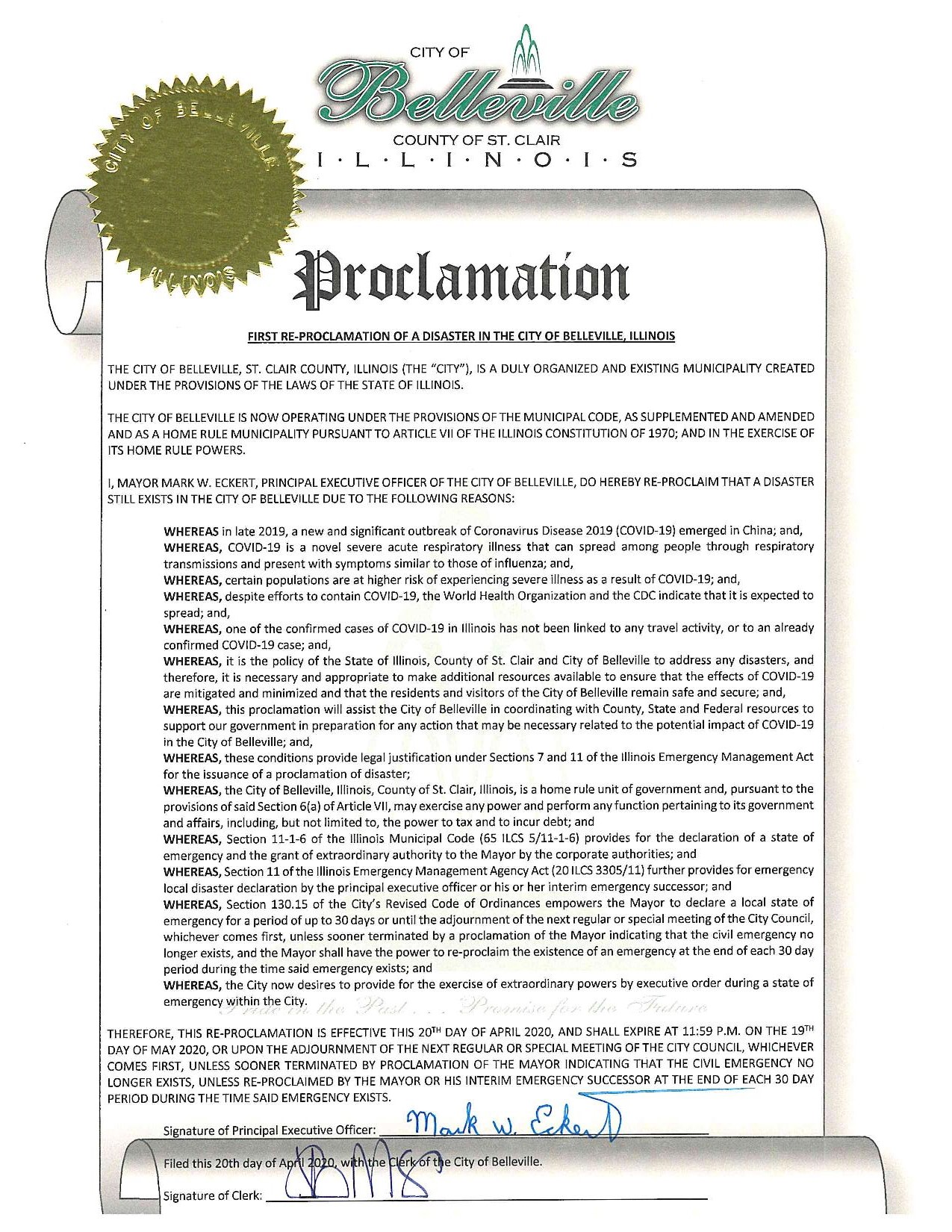 On April 20, 2020, Mayor Eckert issued a Re-proclamation of a Disaster in the City of Belleville, IL, extending the effective date to May 19, 2020. Read the entire Re-proclamation via the link below.
