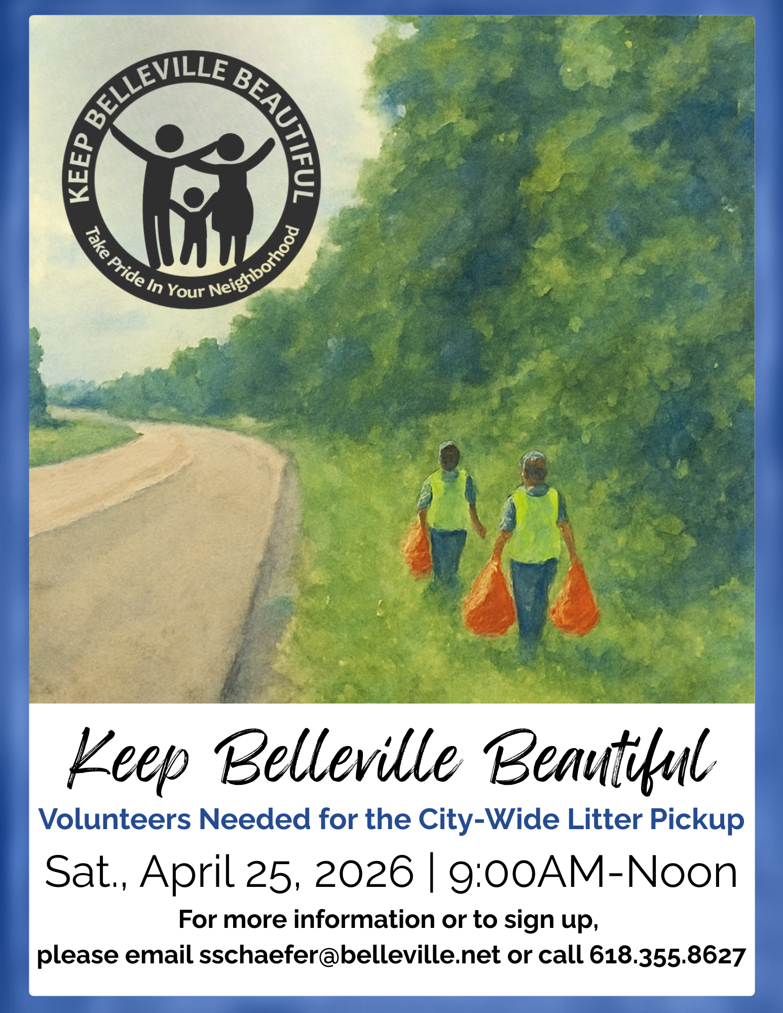 Volunteers Needed for the City-Wide Litter Pick Up on Saturday, April 25, 2026, from 9:00 AM-Noon. For more information or to sign-up, please email sschaefer@belleville.net or call 618-355-8627.